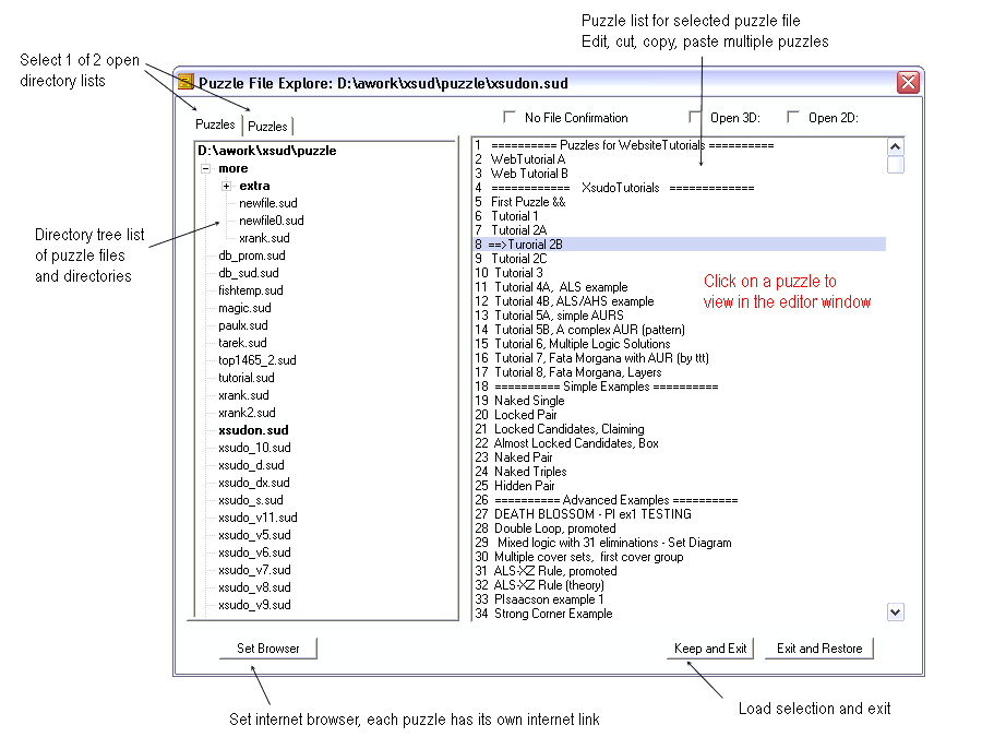 Puzzle File Explorer. The Puzzle File Explorer can save and help organize puzzles. It has twin directory trees for viewing two different directories or files. Puzzles, files, and directories can be cut, copied, and pasted within one view or between two views. All puzzles in the explorer can be viewed in Xsudo's graphical grid display.