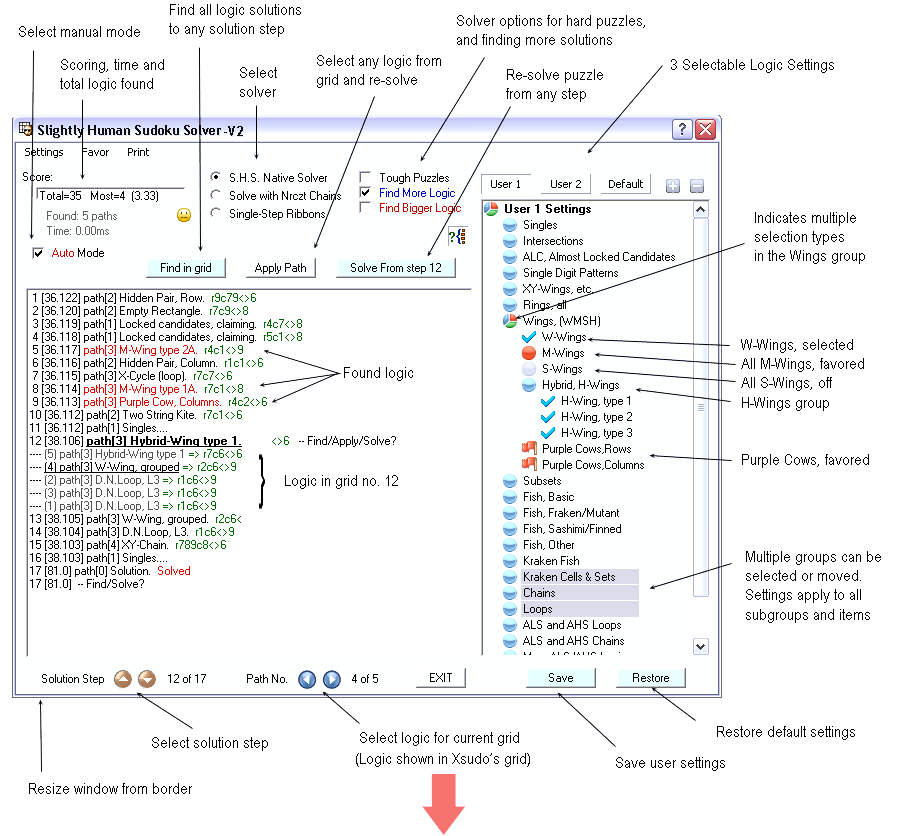 The Slightly Human Solver - Version 2. Xsudo's solver uses a general purpose search method that can find almost any logic including logic that can't be found by other means, hence the name the Slightly Human Sudoku Solver. The solver is fast allowing it to find more logic. Version 2 includes new features for searching grids and controlling the solution all integrated into a single window for easy access. Any one of three separate logic configurations can by used at any time. Each configuration allows any combination of roughly 250 different logical methods to be selected or favored for inclusion in a solution. Logic can be ordered by group or by individual method within a group.