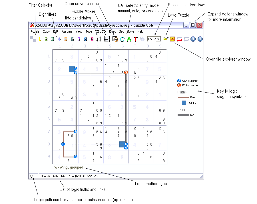 Sudoku's can be solved in different ways. Filters and users' marks can help when solving without candidates. Candidate filters and automatic candidate marking can help when solving with candidates. Xsudo's unique logic editor extends the use of candidates by allowing them to be logically connected and evaluating the results.